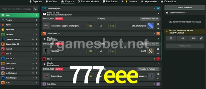 O 777eee oferece uma grande seleção de opções de apostas em e-sports com probabilidades competitivas